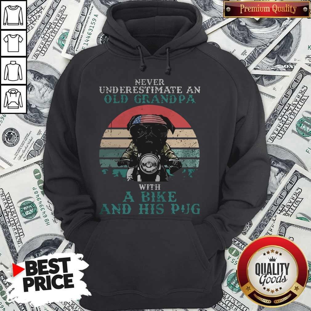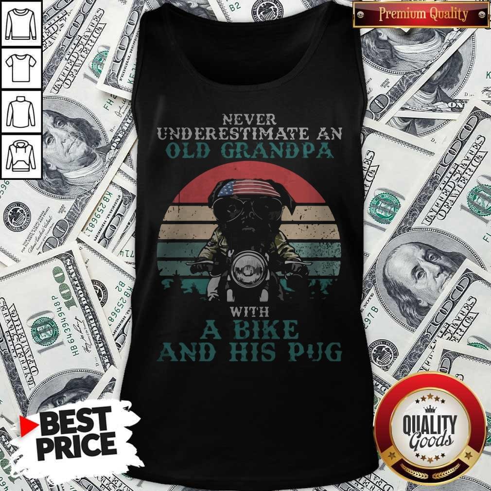Never Underestimate An Old Grandpa With A Bike And His Pug American Flag Vintage Retro Shirt