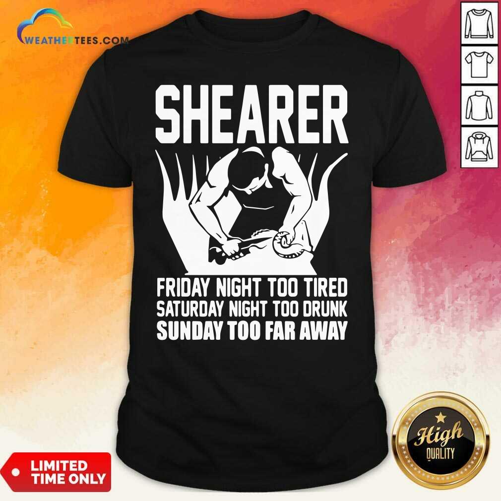 Nice Shearer Friday Night Too Tired Saturday Night Too Drunk Sunday Too Far Away Shirt