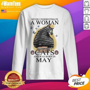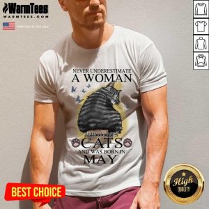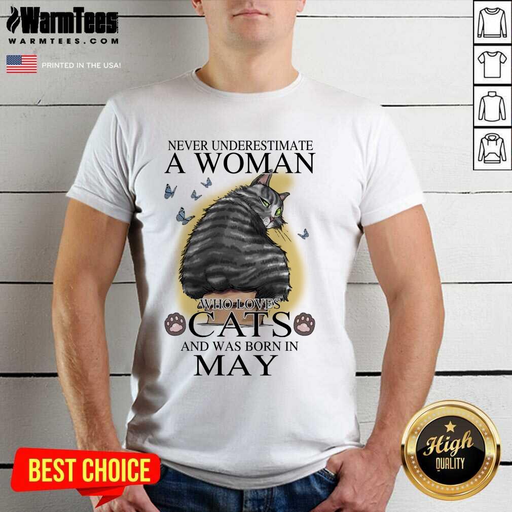 Top Never Underestimate A Woman Who Loves Cats And Was Born In May Butterflies Shirt