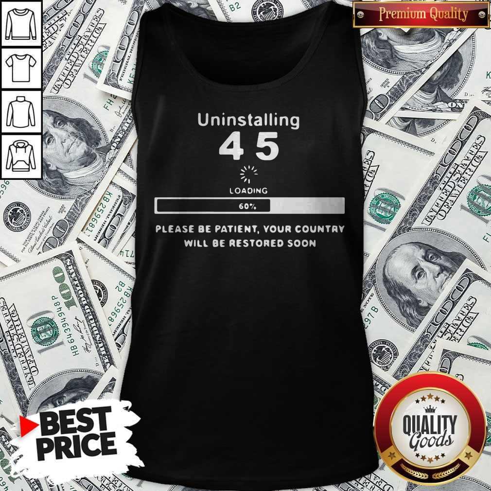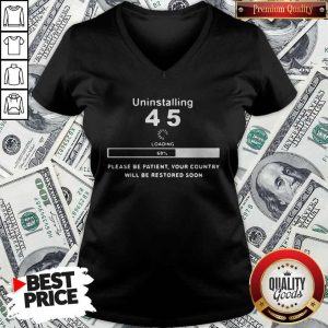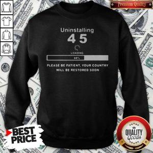 Uninstalling 45 Loading Please Be Patient Your Country Will Be Restored Soon Shirt is a unique and eye-catching piece of apparel that cleverly combines humor and a subtle political message. Perfect for those who wish to make a statement, this shirt is designed for comfort and style. It offers wearers a chance to express their thoughts while staying trendy.